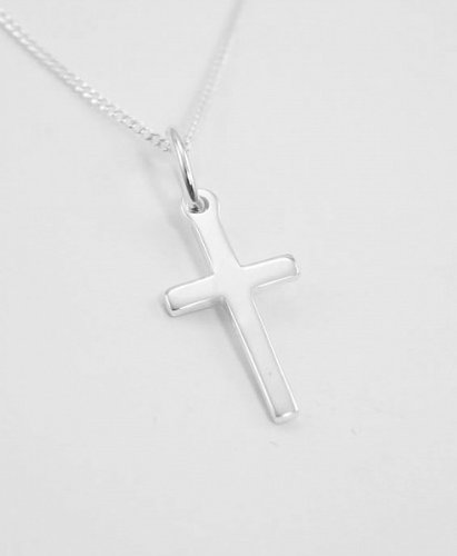 Sterling Silver small solid cross pendant. A simple contemporary cross pendant from one of our leading designers. Comes with an 18" (460mm) pendant chain and jewellery presentation box. Size 22mm x 12mm.