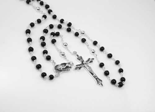 Full length Rosary beads with black stone beads and a high quality Sterling Silver crucifix. Made to the highest standard with quality Silver fittings and presented in a luxury jewellery case.