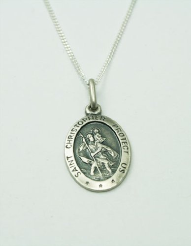A delicate St Christopher Protect Us pendant in an unusual oval shape and in an antiqued finish. Available with a sterling silver 16 or 18 " pendant chain. Comes in a jewellery presentation box with matching gift bags available as an extra option. Size: 17mm x 12mm (excluding loop at top of pendant)