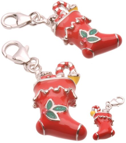 Sterling Silver Charm with festive Christmas Stocking Design. Charm is coated with Red, Green, and Yellow Enamel. Lobster clasp allows you to easily attach your charm.