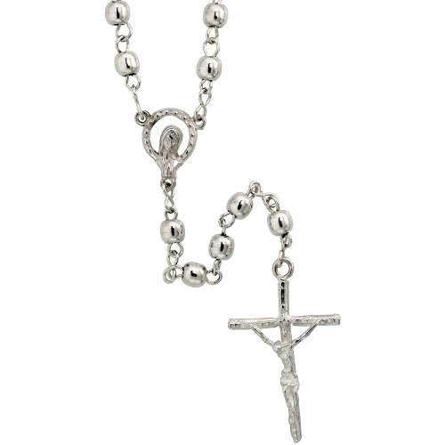 This Rosary is Made in Italy and it's Solid Sterling Silver. The Quality of Workmanship is Excellent, the Chain Is Strong but Light Weight and the Beads are 1/8" (3 mm) in Diameter. The Rosary Center is a very nice detailed the depiction of the Holy Virgin. The 24 inch length doe's not include the hanging part. The Cricifix is 1 3/16 inches long.