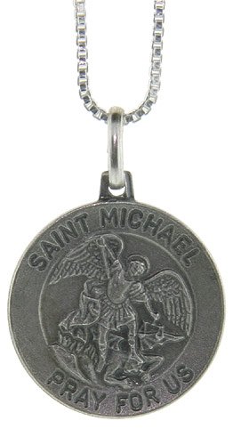 This is a Sterling Silver St. Michael Medallion for Police and Firemen. It's made in Italy and it has a beautiful Antique finish. It's 3/4' in diameter which is a little larger than a dime, and it comes with an 18" Small Box Chain as shown.