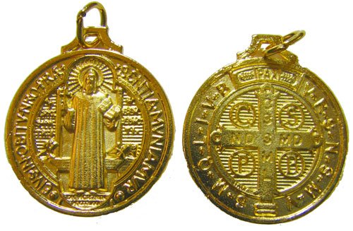 Catholic rosary medal - St. Benedict image - gold colour metal 25mm