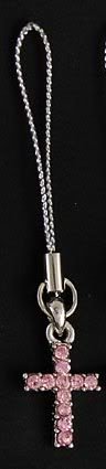 A rhinestone mobile phone charm designed as a pink cross. Strap approx 2 inches and charm approx 1 inch. Will arrive in a protective display cover.